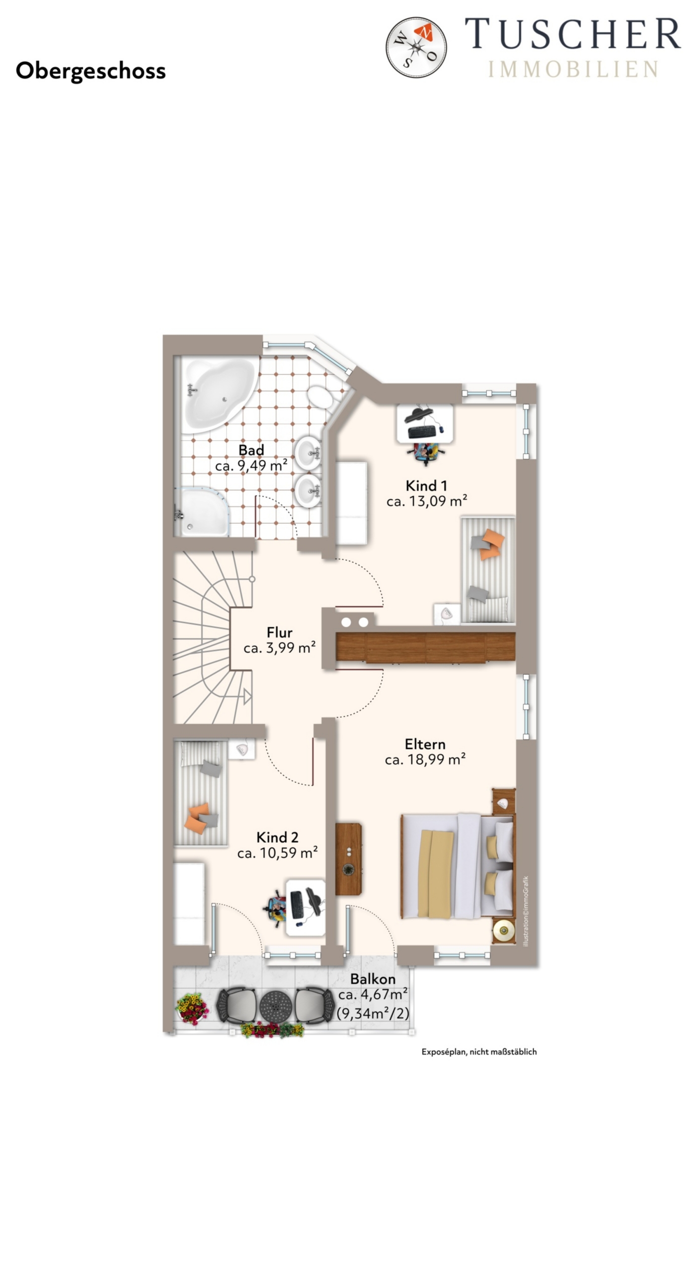 Im Obergeschoss stehen drei Schlafzimmer zur Verfügung. Das mögliche Elternzimmer bietet mit ca. 19 m² eine komfortable Größe und einen direkten Austritt auf den Balkon, während zwei Kinderzimmer mit ca. 13 m² und ca. 11 m² flexibel als Kinder-, Gäste- oder Arbeitszimmer nutzbar sind. Das Familienbad ist angenehm großzügig geschnitten und mit einer Dusche, Wanne, WC und Tageslichtfenster voll ausgestattet.