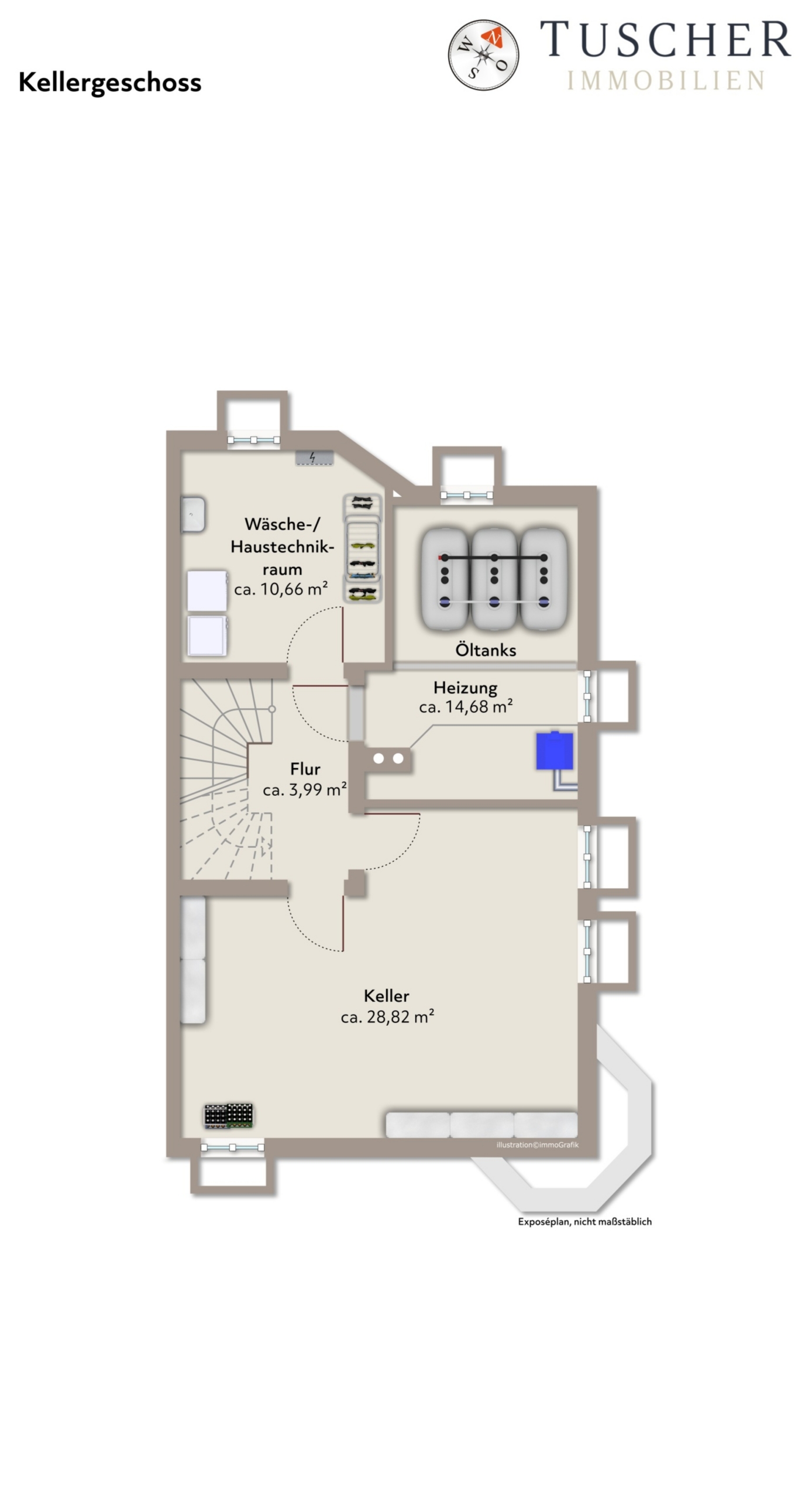 Im Kellergeschoss stehen weitere praktische Flächen bereit. Ein großer Kellerraum mit ca. 29 m² eignet sich hervorragend als Hobby-, Lager- oder Vorratsbereich, hinzu kommen ein separater Waschraum sowie der Heizraum in dem auch die Öltanks angeordnet sind.